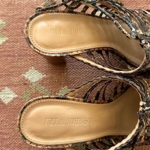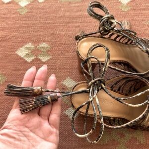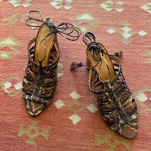 Ulla Johnson Rayna snake print leather lace up high heeled sandals wrap tassels