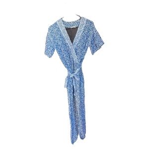 The crossover V neckline is secured with a covered snap, and an attached self-belt ties at the waist. Covered elastic cuffs. Slant hip pockets. Short sleeves.