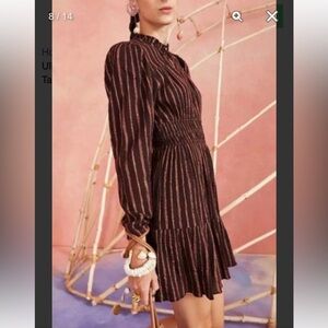 Ulla Johnson Rosalind dress in Chocolate. Striped with metallic lurex thread throughout. Split tie neck with long sleeves and pockets. Gathered waist and puff sleeves.