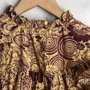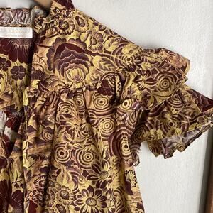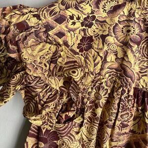 The Letty Top is designed in our psychedelic printed poplin, an artwork featuring gold florals set against an amber background. It features a boxy silhouette and is designed with layered flutter sleeves and a stand-up collar. It has a split-open neckline with a matching tie which can be worn open or closed.