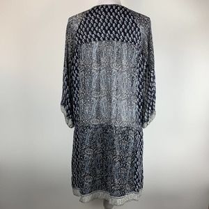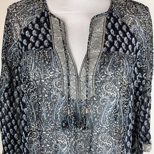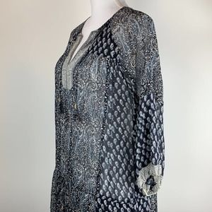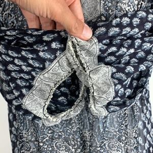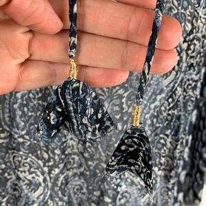 Paisley patchwork mini-dress. Alternating patches of paisley prints, hand-tied rosette tassels with gold threading, lightweight washed silk georgette, drawstring closure, gathered cuffs, blouson style, lined skirt, relaxed silhouette