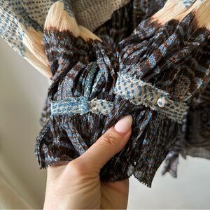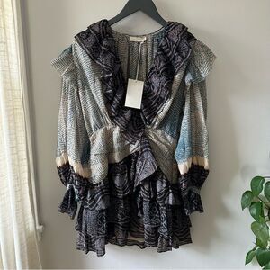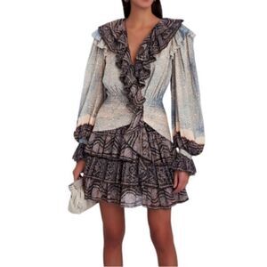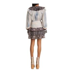 Ulla Johnson Sara Metallic Blue Stripe Ruffle Long Sleeve Silk Mini Dress