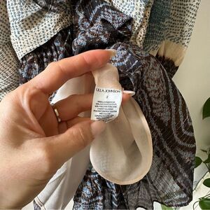 JOHNSON's Sara Metallic Stripe Ruffle Long Sleeve Silk Minidress! A silk chiffon fabric is accented with an allover swirling print and contrasting borders as it shapes this chic dress that features a V-neckline with a ruffled trim, and the long sleeves with ruffled cuffs. A ruched waist falls to a trendy tiered skirt that ends at a mini hem. Pair with lacy heels and a clutch for a complete look