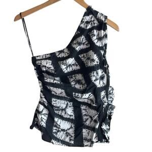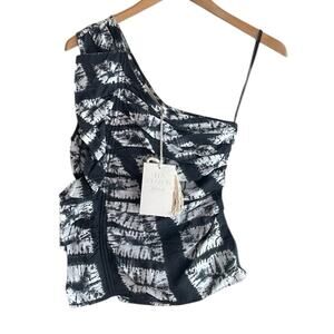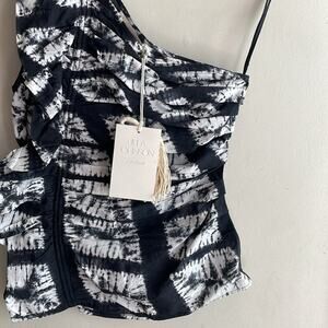 The Ulla Johnson Senta Top in Paragon is one shoulder top with a sculpted feel. This top features an indigo diamond pattern created with the Japanese shibori dying technique. A single ruffle stretches vertically down one side of the top creating a modern, asymmetric look.
