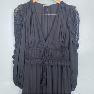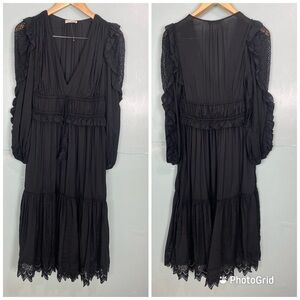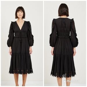 Ulla Johnson Sheila Dress Black Ruffle Midi Long Sleeve Embroidered Dress Sz 8