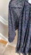 Dark navy silk with dotted floral print, long sleeves, plunge back with tie closure, flounce ruffle hem, lined body, size 4.