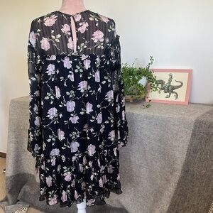 GORGEOUS NWOT condition. Silk dress with subtle extire and delicate pale pink rose print. Romantic bell sleeves and slight ruffles at shoulders and various tiers on sleeves and body of dress. Lined starting at the tip of bust, illusion top with keyhole and button at back. ITS INCREDIBLE. Please see measurements.