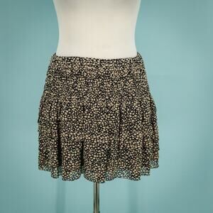 Ulla Johnson Size 2 Black Tan Print Smocked Elastic Pull On Stretch Waist Layered Style 100% Silk Mini Skirt