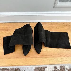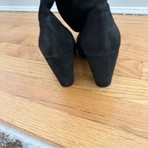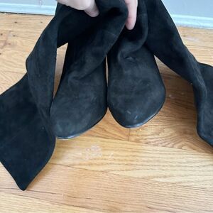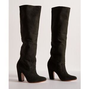 Handmade knee-high suede boot with slightly slouchy silhouette, detailed stitching at ankle, and 4" covered suede heel. Handmade in Peru.