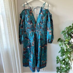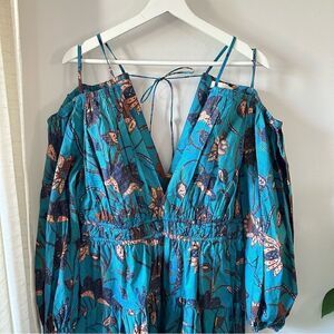 The Tahlia Dress is a stunning new silhouette, cut in Ulla Johnson's signature cotton poplin and patterned with large-scale florals across a subtle geometric background. Barely-there straps suspend the off the shoulder cut, met with a deep v cut at the center front. This dress has a fixed waist and hidden side-seam zipper.