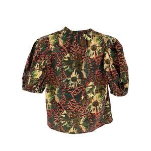 Ulla Johnson 'Tillie' Orange Cotton Floral Top Size 0: lightweight, non-stretch poplin, split v neck and ruffle collar, elbow-length puff sleeves with elastic cuffs, floral print, measurements: 18 inch bust x 21 inch length.