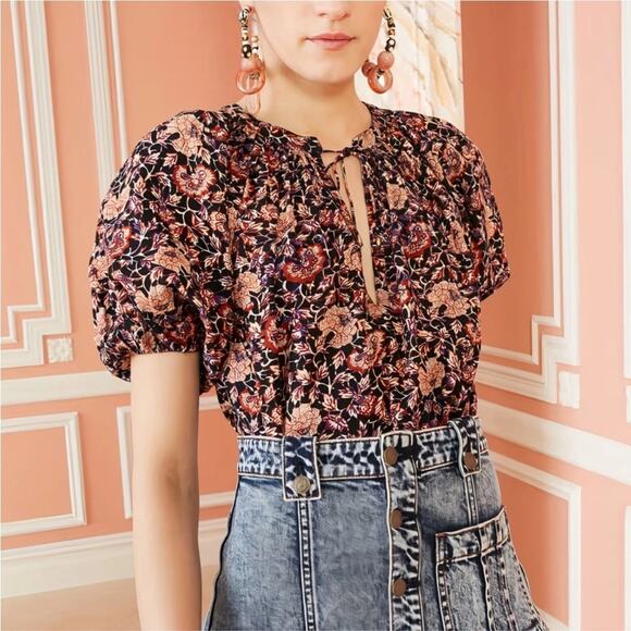 Ulla Johnson Top Womens 2 Evie Blouse Midnight Floral Puff Sleeve V-Neck