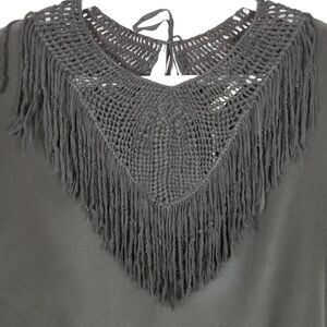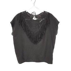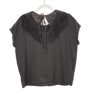 100% silk blouse with viscose "macrame" trim around the neckline. Tie closure at back of neck. Cap sleeves. Color is called "Raven". Handmade in India. Approximate measurements: 21" chest, 22" length.