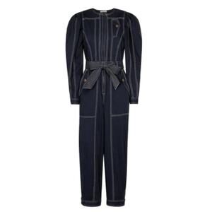 Midnight blue cotton Leo contrast-stitching denim jumpsuit from ULLA JOHNSON featuring contrast stitching, tied waist, round neck, front zip fastening, long sleeves, two side inset pockets and two rear flap pockets.