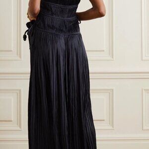 Ulla Johnson’s Valeria dress is a size 4, made from lustrous plisse-satin in deep midnight blue. With a plunging V-neckline, it has a gathered bodice with ties at the sides that make for a flexible fit. The dropped waist falls to a dramatic flooring-sweeping hem.