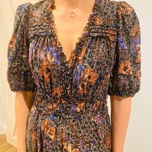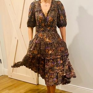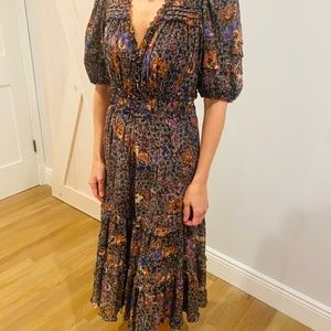 Ulla Johnson V-neck Flower brown Dress Size 6 Short Sleeve Tier Boho Fairy