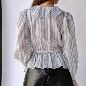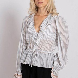Elegant blouse with ruffle details. Features a tie front. Long sleeves with ruffled cuffs. Perfect for a chic look.