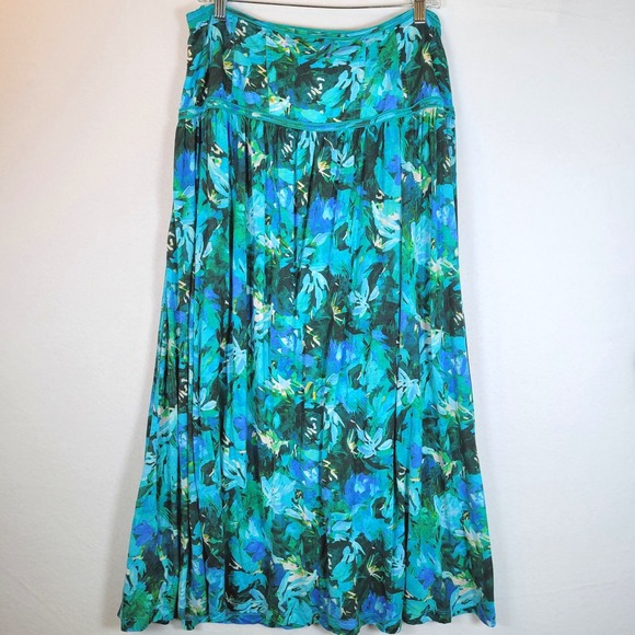 Keywords: Ulla Johnson, maxi skirt, floral print, abstract, teal, blue, green, bohemian, resortwear, lightweight, viscose, designer, summer, flowy, vacation