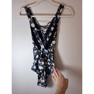 Make the boardwalk your catwalk in this vacay-beckoning one-piece swimsuit that stands out from the crowd with a lace-up neckline and watercolor flora.