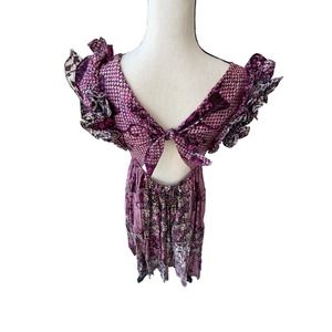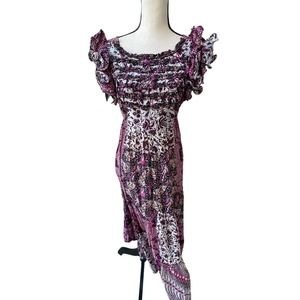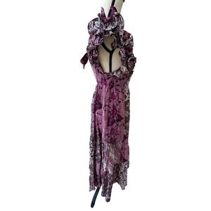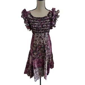 Gently used great condition. An intricate patchwork ikat pattern romantically ruffled dress. Features hidden zip, adjustable tie back, pockets, ruffle bib details, floral print, unique patchwork details, short sleeve with scoop neck. Made of 71% cotton, 29% silk.