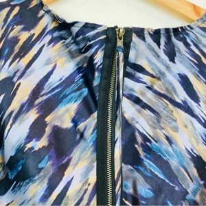 Ulla Johnson silk abstract brushstrokes print sleeveless dress in blues and purples. Faux wrap skirt and raw edge on neckline, sleeves and skirt. Zip back. Size 6