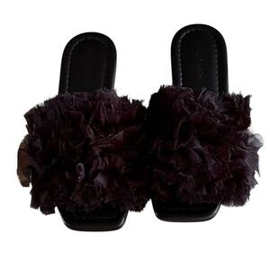 the Helia Slide is made in Italy from black leather with an explosion of ruffled organza–a luxurious fabrication showcased throughout the rest of our collection. These black ruffle slides feature a leather lining and outsole and pair effortlessly with our dresses, skirts, and denim.