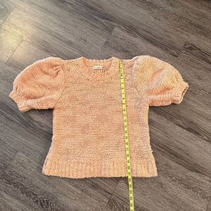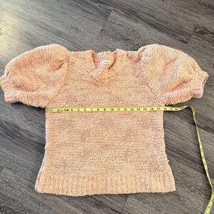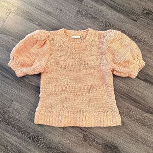 Chunky knit pullover with subtle metallic thread and puffed short sleeves.