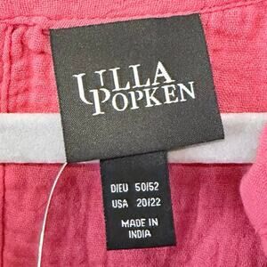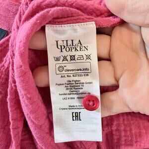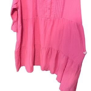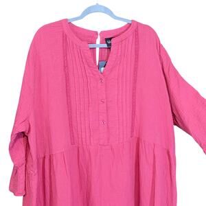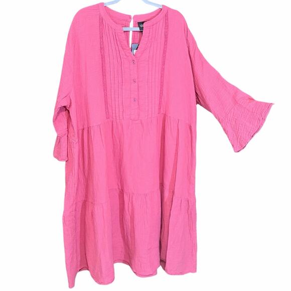 Bright coral pink tiered midi dress from Ulla Popken, a well known UK and European plus size brand. Made from lightweight 100% cotton with a soft crinkled texture that feels easy and breathable. Features a relaxed fit with a partial button front, pintuck detailing at the bodice, and flowy tiered skirt that moves nicely. Long sleeves with a loose, comfortable drape give it a boho cottagecore feel that works great for spring and summer. This dress is new with tags and has never been worn. A fun statement color that pairs well with sandals, clogs, or sneakers for an effortless everyday look.