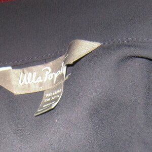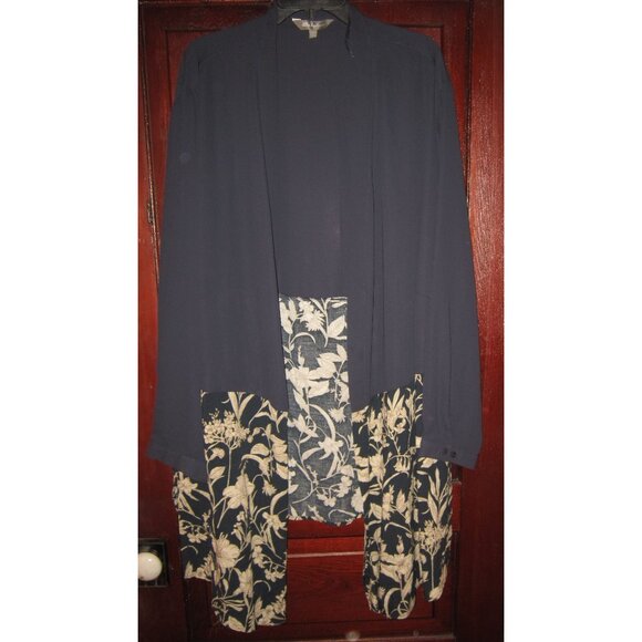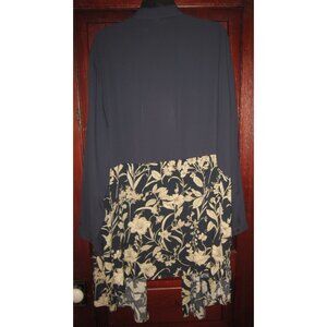 This listing is for a lovely size 32/34 longer kimono style duster from Ulla Popken. The duster is a navy blue poly chiffon on the upper portion and a viscose floral print fabric on the bottom. There are about 6 inch bottom side slits.
