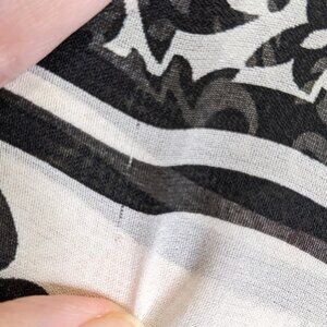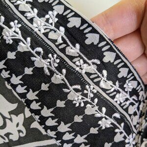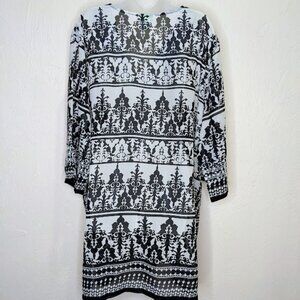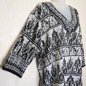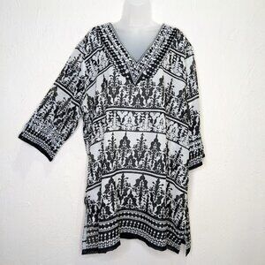 FEATURES/ACCENTS: Semi Sheer Lightweight V-neck Caftan. Polyester fabric. 3/4 sleeve, Tunic length, Oversized fit, Shift, knee length. Black and White All Over Floral Indian Print with white embroidered detail at neck and wrists. Pull on.