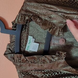 Gorgeous piece, NWOT, pockets, front buttons, ruffled collar, flounder sleeves. Lightweight, not lined.