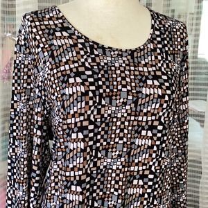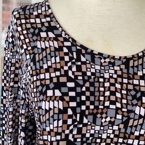 I think I wore it one time. It has a scoop neck and three-quarter length sleeves. The colors are black, beige, gray, and white