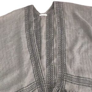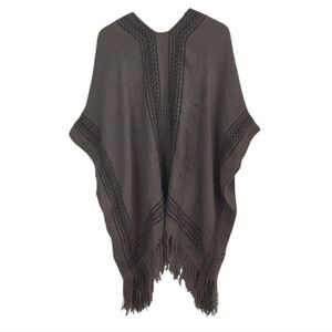 Elegant poncho with intricate black patterns. Features fringe detailing. Perfect for layering.