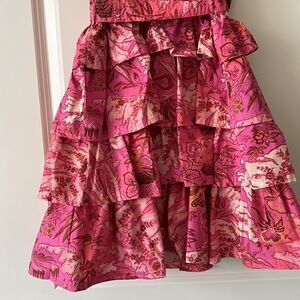 The Lulua mini dress is made from crisp cotton poplin that is printed in our Paradise Lost artwork, a dense print of spotted orchids, unfurling palms, and geometric ferns against a hazy background. This party-ready silhouette features a tiered ruffle skirt and layered flutter sleeves framing the flattering open neckline. Wear its removable sash to further define the elastic nipped-in waist.