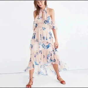 This was designed for dreamy days and bohem vibes. Wispy silk captures the uplifting watercolor florals that cascade down a halter neck and tiered bodice creating exquisite movement through a trailing hem.