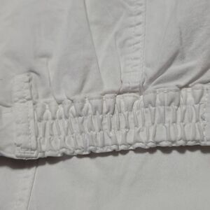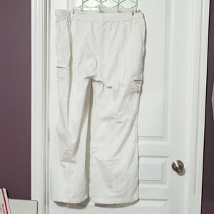 Pretty white pants with several pockets and two of the pockets are snap pockets with zippers. The waist has a snap button with a tie string.