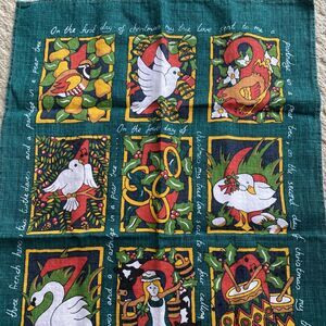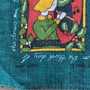 Ulster 100% Irish Linen Tea Towel - this example is in a Christmas Themed design depicting the 12 Days Of Christmas. Clearly hallmarked and made in Ireland - this cloth has been laundered and it is a bit faded but overall condition is very good with no damage or significant flaws. Fun for the holidays - the perfect host/hostess gift!