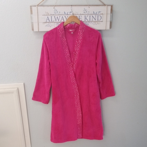 Super soft hot pink Ulta Beauty robe embellished w/bling like polka dots and lower front pockets and inside tie tie for ultimate comfort. Note: robe does not include outer tie (missing) Love 💕