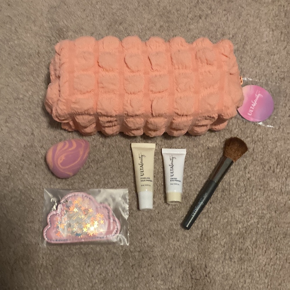 Includes puffy cosmetic pouch, make up blender, blush brush, cloud keychain, .16oz tinted eye primer, & .33oz poreless face primer.