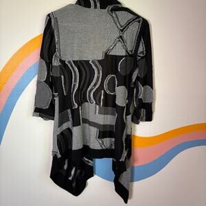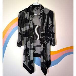 Button up cardigan (snaps) asymmetrical hem, long cardigan, black and gray, geometric pattern, textured knit, layered look, statement jacket, artistic design, 3/4 sleeves, art to wear, bold pattern, knitwear, retro vibes, unique