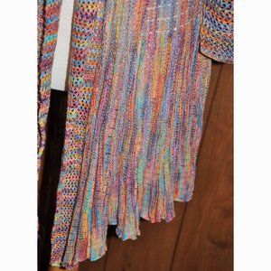 This is a beautiful super soft knit sweater made by Ultimate that has an asymmetrical hemline with long sleeves. The colors are gorgeous and all have soft hues with longer lengths in the front that almost have a ruffle effect at the bottom. Soft blue, peach, pink, rose, turquoise, purple and lots of other colors allow this to be very versatile because it will match almost anything you have in your closet. It would look amazing with a pair of jeans or wear it to work with a skirt or dress. Its lovely!