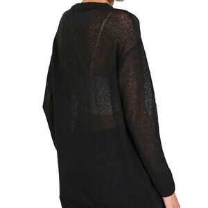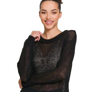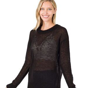 Ultra Fine Round Neck Wool Sweater - Black is perfect for a light layer, or paired over a bralette or bodysuit. The see through design makes this sweater perfect for layering bring all kinds of fun The ribbed cuff, neck and her keep the cold out and the wool and mohair material keeps you warm.
