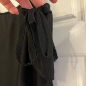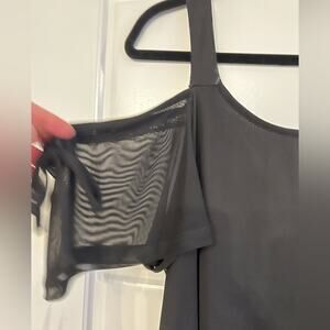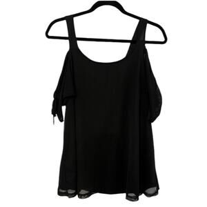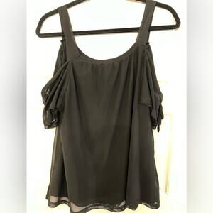 Black color top. Cold shoulder. See through sleeves with a tie at the ends. Top layer of shirt is see through. Same color lining underneath. 95% polyester 5% spandex Lining: 100% polyester