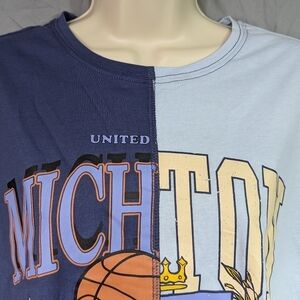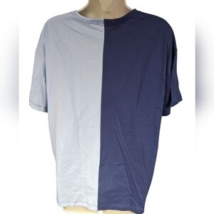 This shirt is new with tags. It features a color block design. It is from the manufacturer sewn from 2 shirts. It is a lightweight jersey knit material. Please see photos for details.