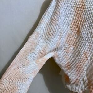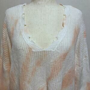 NWT. Tie Dye Distressed Sweater for Juniors Size L. Coral Pink and white, Pullover, variegated ribbed knit construction, distressing, v-neck, long sleeves, oversized style. Please note and shown as a zoomed in picture, there is a spot stain right sleeve. Necklace is not included. Pictures are part of description.