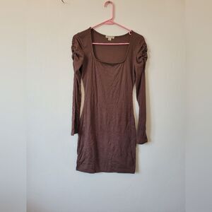 Super cute little ribbed bodycon dress in a midi length. Full length sleeves with cute little ruched puffed shoulders. Square neckline is very flattering. The color is a deep purple brown. Like a chocolate Eggplant color. Great condition. Size small measures approximately 33 inches long 15 inches underarm to underarm laid flat 12 inches laid flat across the waist 15 inches laid flat across the hips.