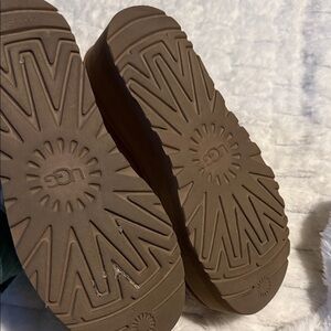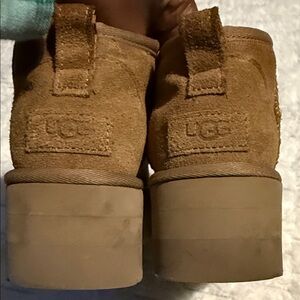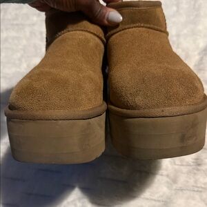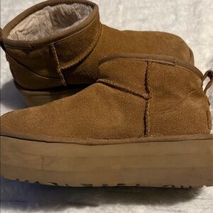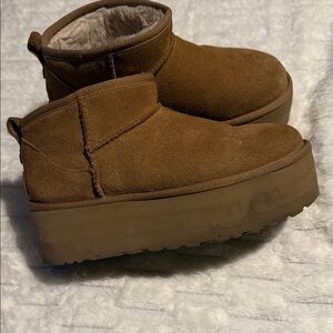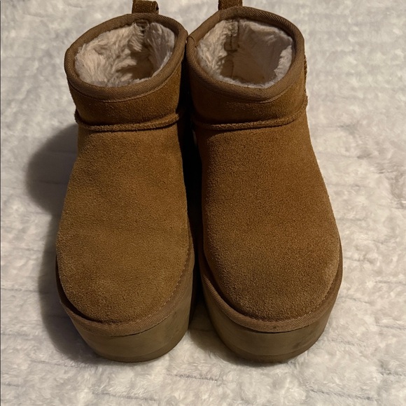 Warm and stylish tan suede ankle boots with plush lining. Perfect for chilly days. Platform heel. Chestnut. Gently worn. See all photos.