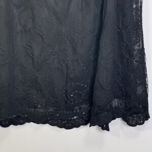 Black lace sleeveless top by Ultra Pink Size 1X (plus). Floral lace overlay with crochet-style neckline + scalloped lace hem. Fully lined for comfort. Easy to dress up with jeans + heels or layer under a jacket for a boho/goth vibe. Preloved but in nice condition