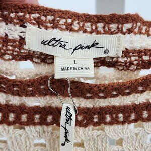 This Ultra Pink brand crochet top and pants set features an intricate boho-inspired design with a lovely blend of brown and cream tones. The lightweight knit material offers breathability and comfort, making it suitable for various occasions. The set's unique pattern and texture add a distinctive flair to your wardrobe.