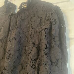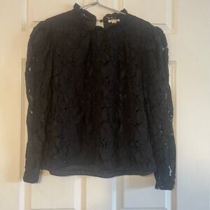 Ultra Pink black long sleeve mock neck lace blouse size L. A black long sleeve mock neck lace blouse from the brand Ultra Pink. It features a high neckline with a ruffled mock neck and ruffled trim on the cuffs. Simply elegant, this lace blouse from Ultra Pink is perfect for any occasion. - black lace fabric - long puff sleeves - ruffled, mock neck - ruffled trim on cuffs - back keyhole with button closure - partially lined - regular fit